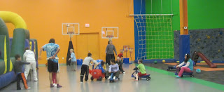 In the main gym, you'll find an inflatibles obstacle course, and a large moon bounce with basketball hoop inside. There are gymnastics mats, a climbing wall and all kinds of fun toys - like hula hoops, scooters, inflatible horses, etc. Upstairs is an XRKade filled with active, virtual reality type games like boxing, bicycling, skateboarding and more. The XRKade is particularly popular with older kids.